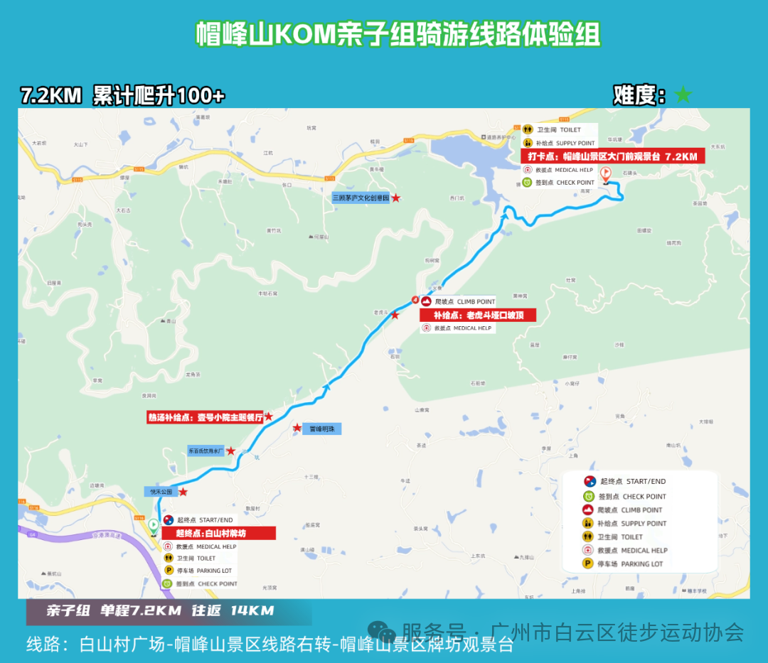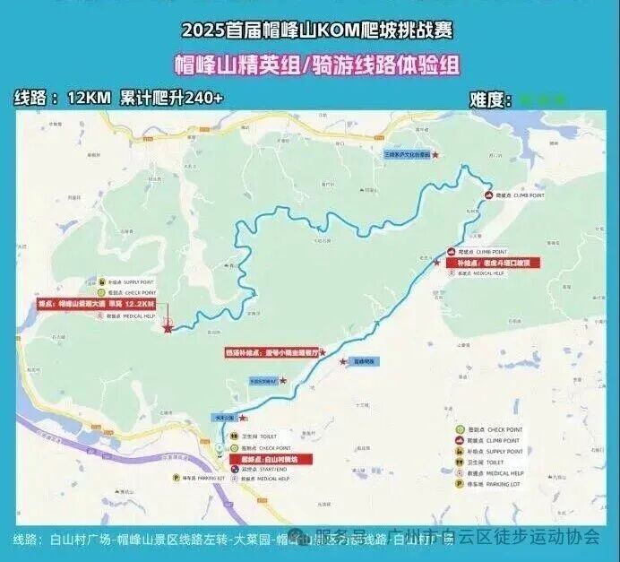 精英组&骑游体验组:白山村广场—帽峰山景区主见左转—大菜园—帽峰山景区里面主见—白山村广场